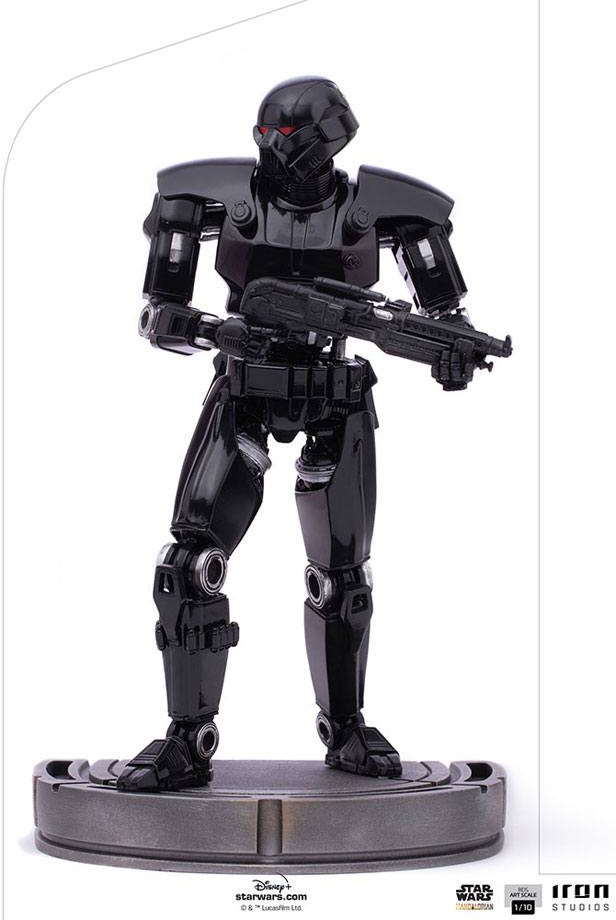 A figure covered in shining black armor is aboard Imperial Officer Moff Gideon's space cruiser, directing his red photoreceptor eyes towards his objective, wielding a large blaster rifle and ready to fire with precision at any target. Iron Studios thus presents its statue of the fearsome "Dark Trooper BDS Art Scale 1/10 - The Mandalorian - Iron Studios", one of the most efficient and powerful Imperial combat droids. Just as seen in the second season of The Mandalorian series, a spin-off from Star Wars on the Disney+ streaming channel.