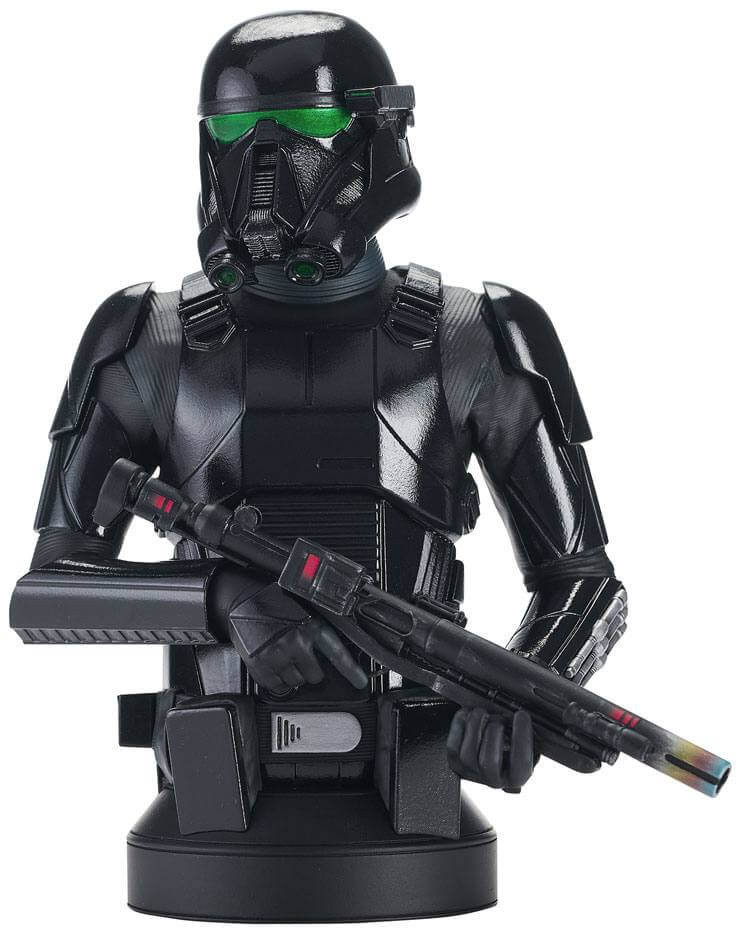 Death Troopern är en elitsoldat i leden av Stormtroopers, för första gången skådad i Star Wars: Rogue One, men sedan dess även i The Mandalorian och många videospel och serietidningar. De är helt klädda i svart rustning som ger ett intimiderande utseende. Bysten är tillverkad i resin och är ungefär 18 cm hög och har skapats med hög detaljrikedom och noggrann målning. Statyn är begränsad till endast 2 000 exemplar och kommer med ett numrerat äkthetsintyg. Produkten är designad och skulpterad av Gentle Giant Ltd.