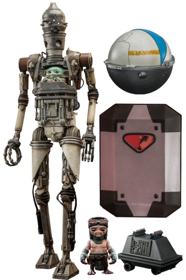The highly-accurate collectible figure specially features a highly detailed mechanical body with great articulations and a cockpit with Grogu, skillfully applied weathering effects, sound effect function that resembles IG-12's "Yes and No" answers, Anzellan Droidsmith with interchangeable arms, food accessories, and a figure display stand.