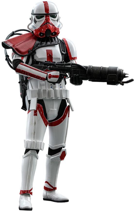 Specialized stormtroopers of the Empire, Incinerator Stormtroopers wield flamethrowers and are equipped with heat-resistant armor. In The Mandalorian, Moff Gideon commands this dangerous soldier to flush out the Mandalorian and his friends from the cantina with devastating power.