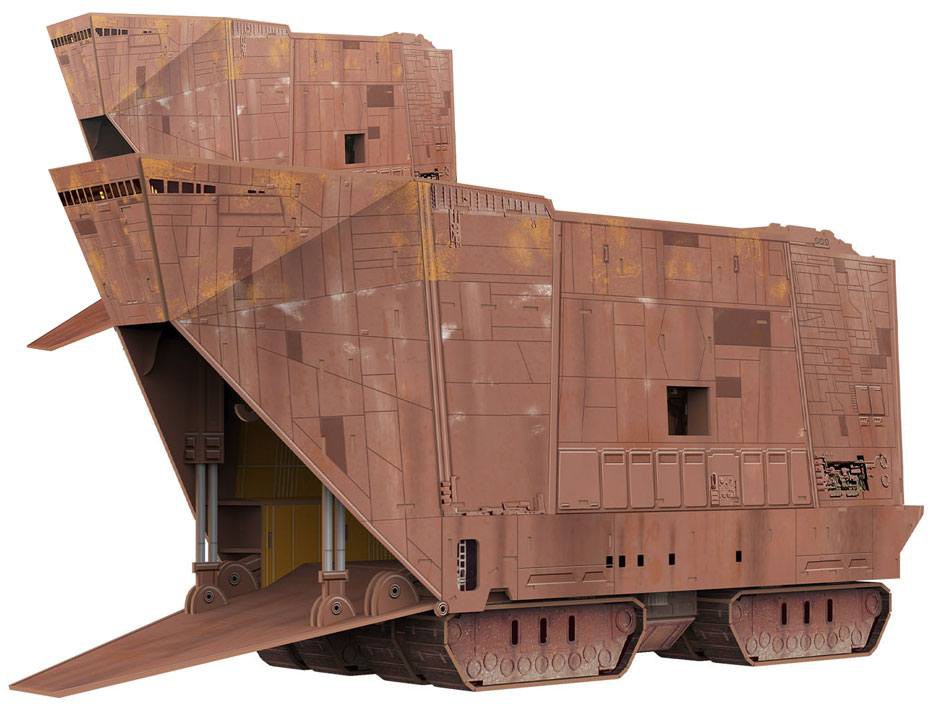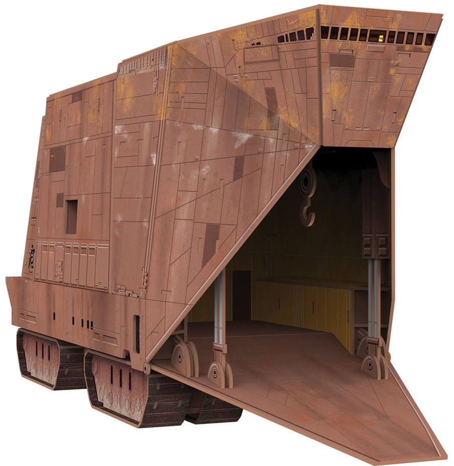 The sand crawler, also called the sand caterpillar, is a tracked vehicle about 20 meters high that is used by the Jawas as a dwelling place and as a transporter for droids.