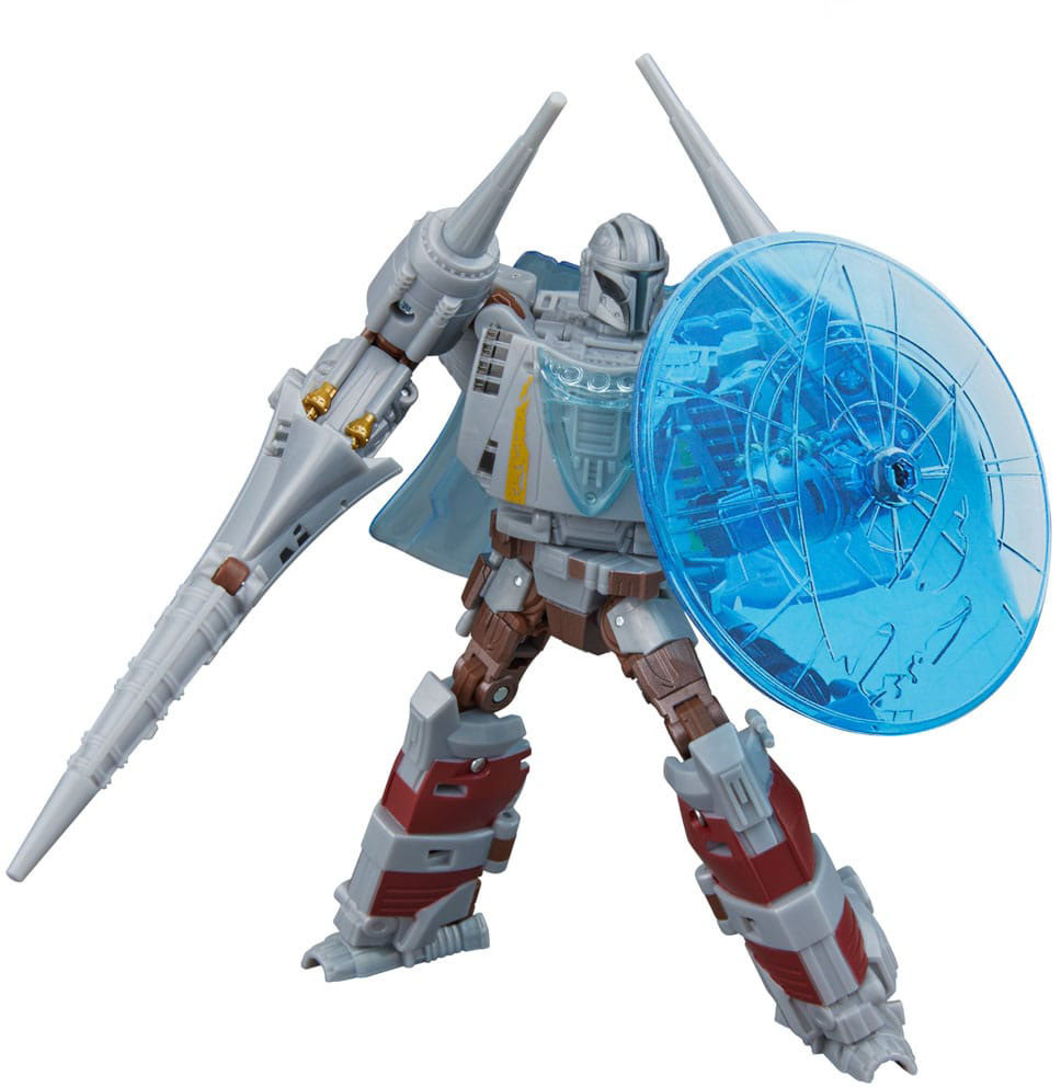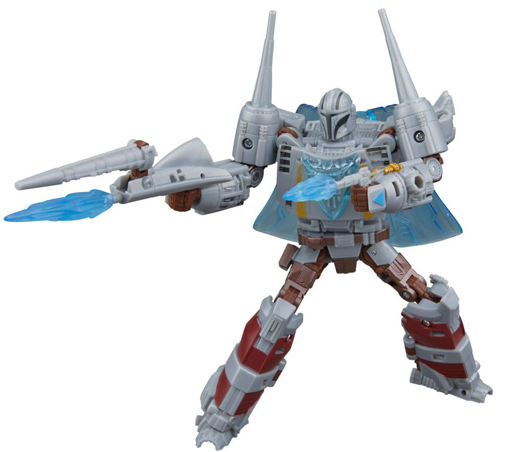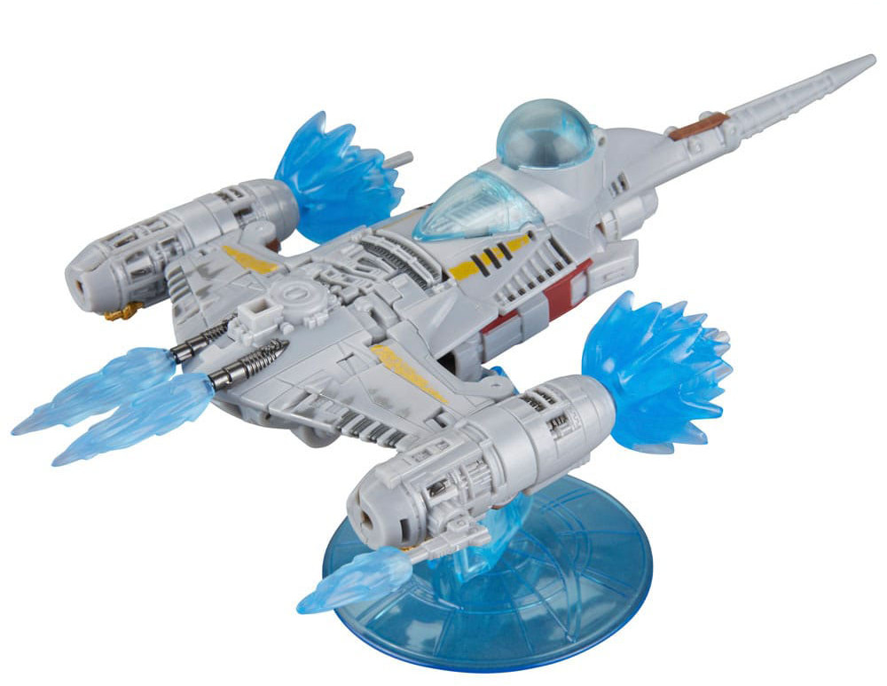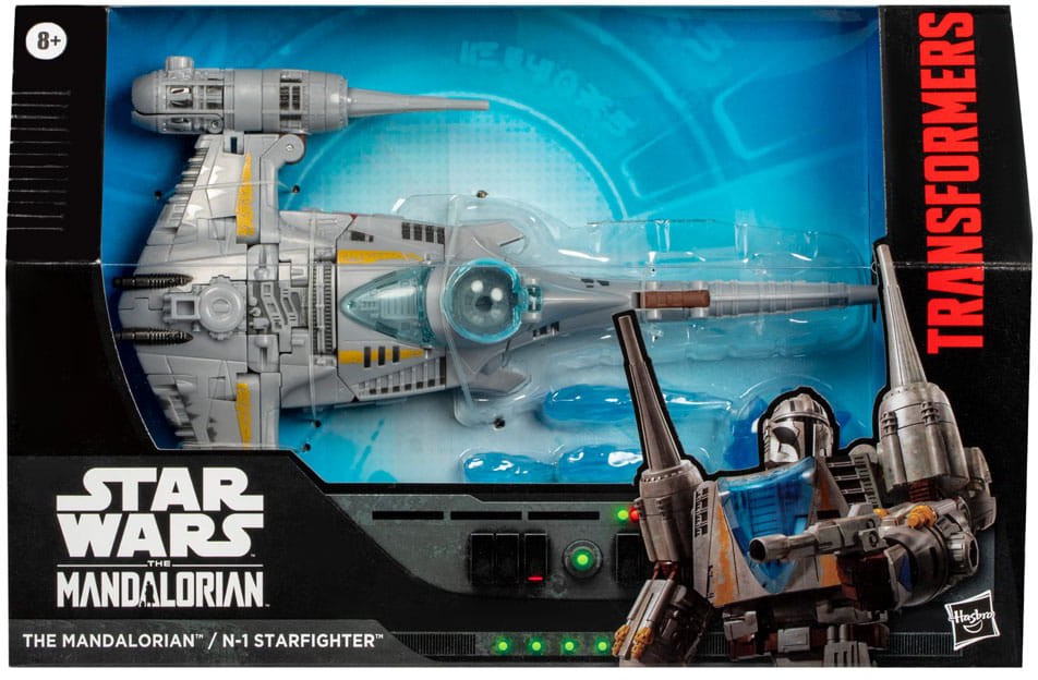 The iconic N-1 Starfighter from Star Wars: The Mandalorian is now a converting Transformers toy! This 7.5-inch (19 cm) figure converts from character mode to N-1 starfighter alt mode and features series-accurate deco and details from The Mandalorian series. It includes 6 blast effects that attach in both modes, 2 blasters, and a shield and cape that convert to a display stand for the figure in starship mode. Transformers robots have always been - More Than Meets the Eye - but now, through the Transformers Collaborative, fans can experience these larger-than-life characters as they team-up, mash-up, and meet up with other characters, teams, and people who share this same special quality.