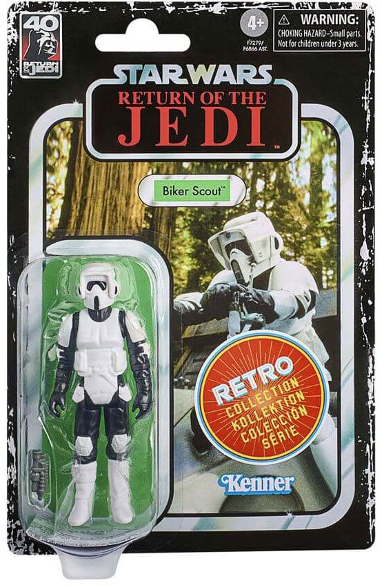 Den 3,75 tum höga Retro Collection-figur är detaljerad för att se ut som Biker Scout från Star Wars: Return of the Jedi, med design och detaljer inspirerade av Star Wars-figurer från 1970-talet