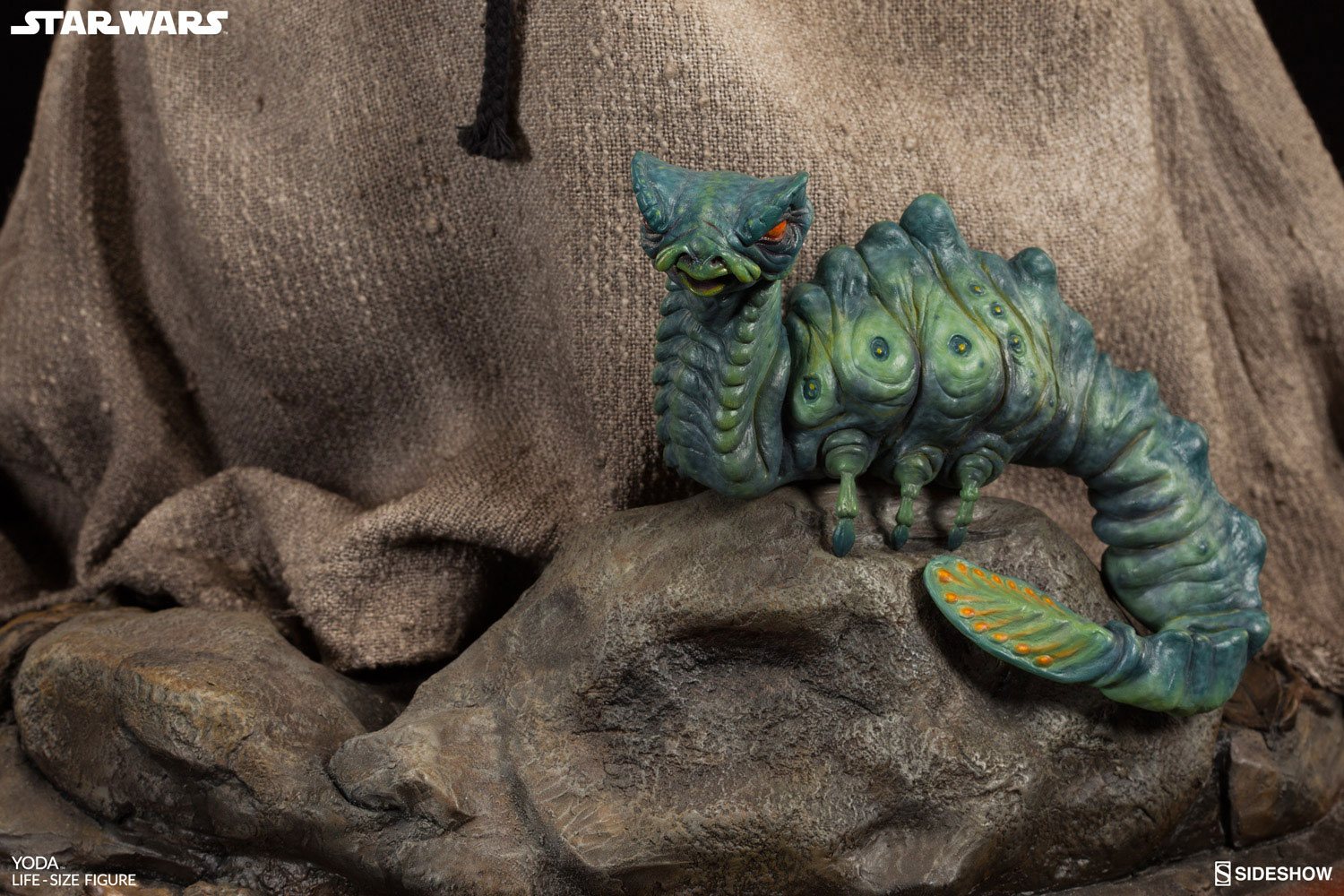Sideshows artister har helt enkelt fångat magin i Frank Ozs ursprungliga marionett i denna magnifika replika. Sideshows Yoda-replika i fullstorlek är 81 x 53 x 53 cm lång på en miljöbas med Dagobah-tema (komplett med färgglada morp critter).