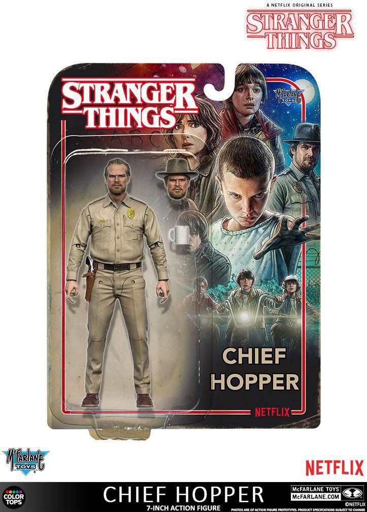 Straigt from the sci-fi series ´Stranger Things´ comes this action figure of Chief Hopper. It stands approx. 18 cm tall and comes with accessories in a retro-themed blister packaging.