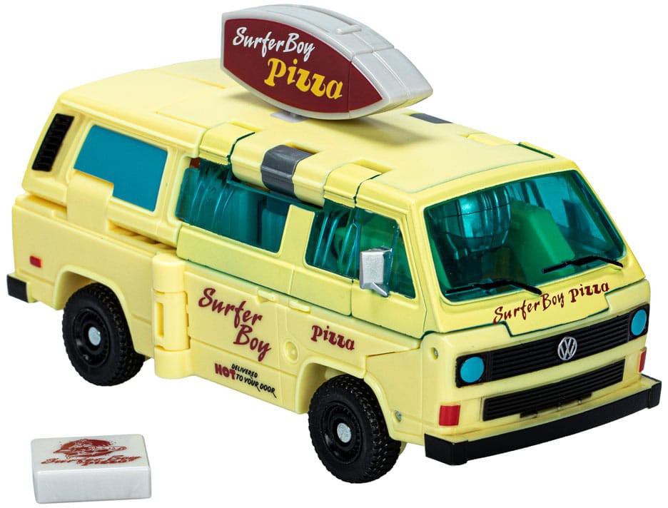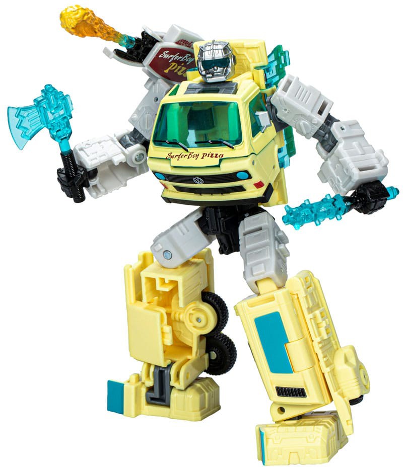The worlds of Transformers robots and Stranger Things collide with the Stranger Things x Transformers Code Red mash-up pack! The iconic Surfer Boy pizza van from Stranger Things is now a Transformers robot! This figure converts from robot mode to show-inspired licensed Volkswagen Vanagon alt mode and features screen-accurate deco and details. This pack comes with show-inspired accessories including a bat, axe, Surfer Boy pizza blaster, and pizza box accessories, plus a blast effect. Transformers robots have always been -- More Than Meets the Eye -- but now, through the Transformers Collaborative, fans can experience these larger-than-life characters as they team-up, mash-up, and meet up with other characters, teams, and people who share this same special quality.