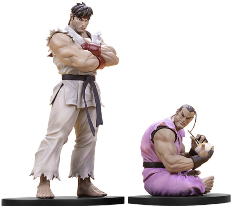 Båda figurerna i det här setet är helt skulpterade, Ryu står trotsigt med armarna i kors och stirrar på sin nästa motståndare. Hans allvarliga uttryck är inristat i ansiktet med en stiliserad look som speglar Street Jam-konstverken. Hans klassiska vita gi är skulpterad i verklighetstrogna detaljer och kompletteras av hans klarröda handskar och pannband, det svarta bältet är prydligt knutet runt midjan.