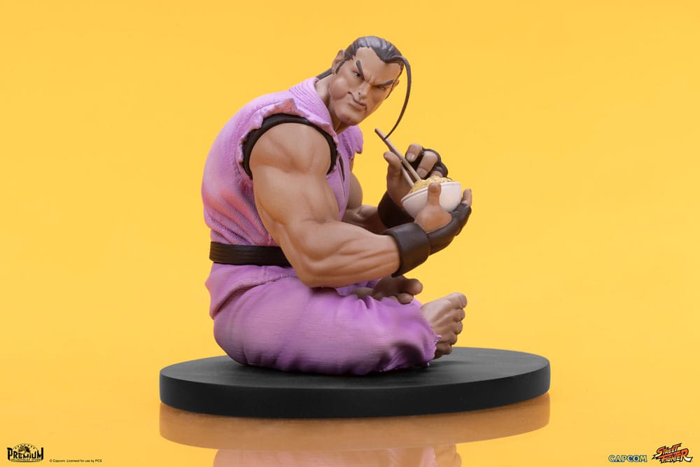 Dan å andra sidan sitter avslappnat med benen i kors över en rykande skål nudlar. Han tittar sig över axeln, som om han var irriterad över att bli avbruten i sin måltid, men inte tillräckligt för att sakta ner. Hans porträtt är skickligt skulpterat för att avbilda inte bara hans irritation ... utan också hans tydliga munfull mat. Hans rosa gi är skulpterad i detalj och kontrasterar mot hans mörkbruna handskar och rash guard. Ett rosa hårband som matchar hans gi håller hans täta hästsvans på plats, med undantag för en enda hårslinga som bågar ut från hans panna.