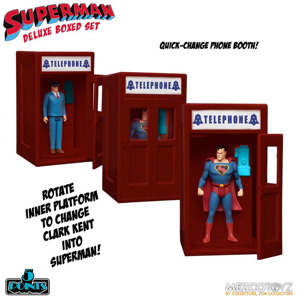 5 Points presenterar Superman (1941): Deluxe Boxed Set, inspirerad av 1940-talets animerade kortfilm 'The Mechanical Monsters'. Detta Superman Deluxe Box Set innehåller 3 figurer: en enorm eldsprutande robot, ett telefonbås för snabbt ombyte och ett diorama i flera nivåer!