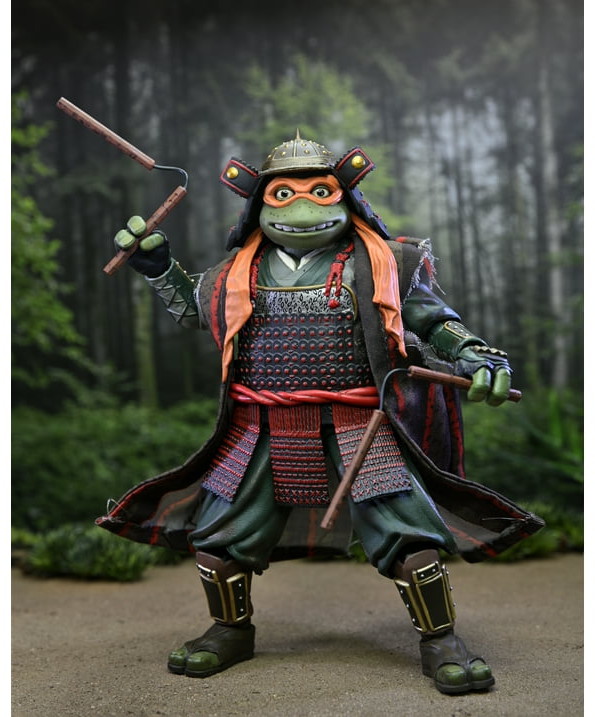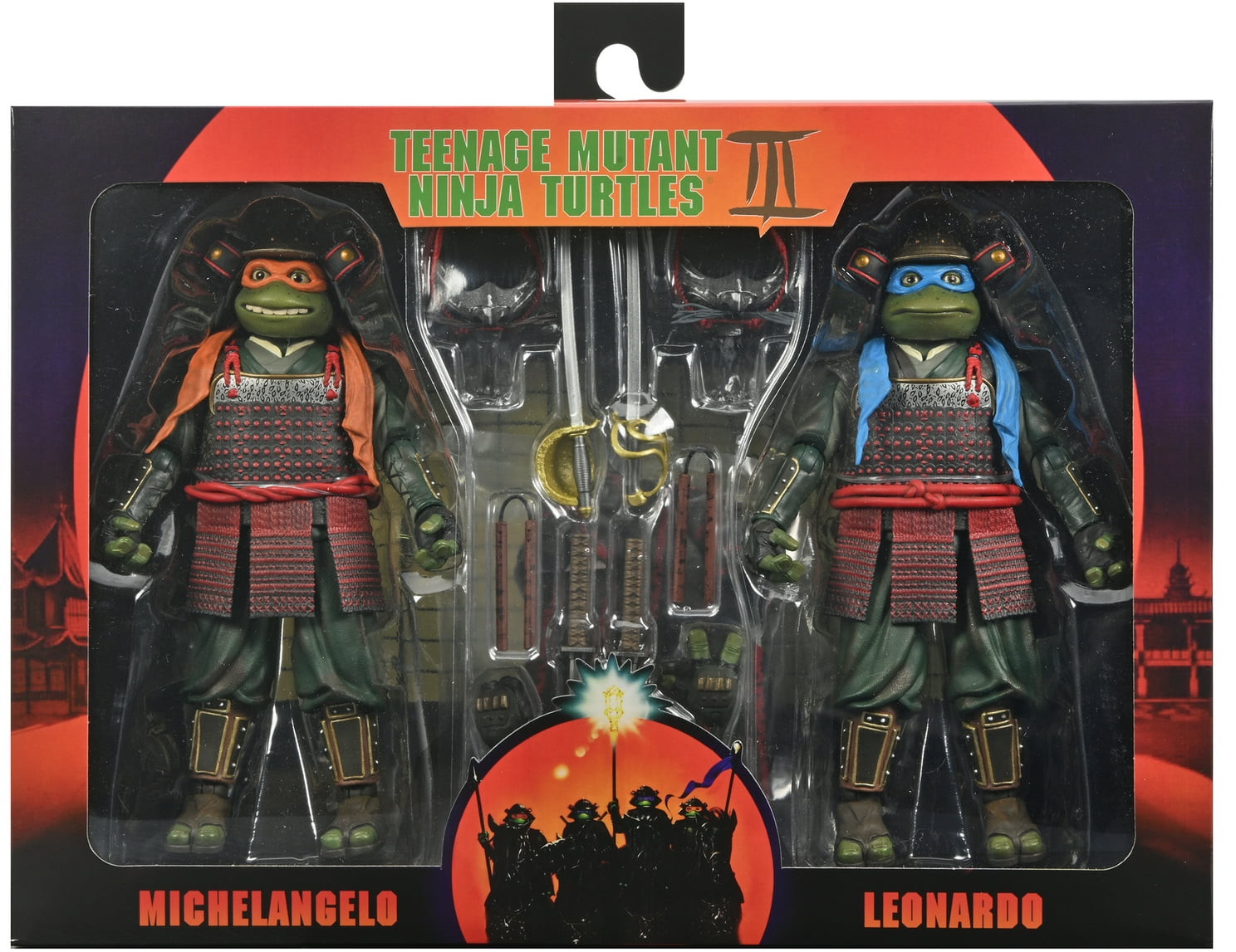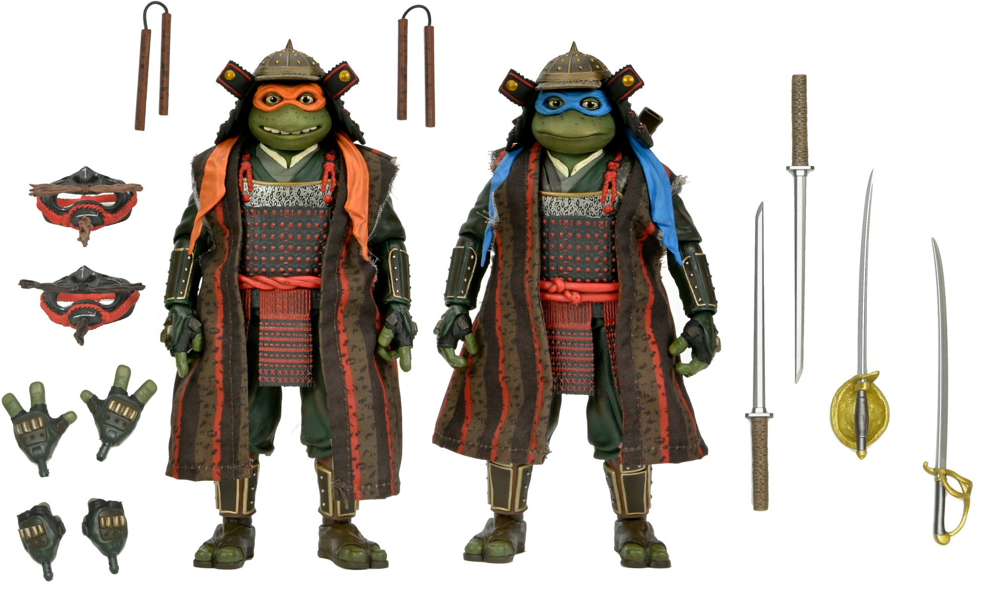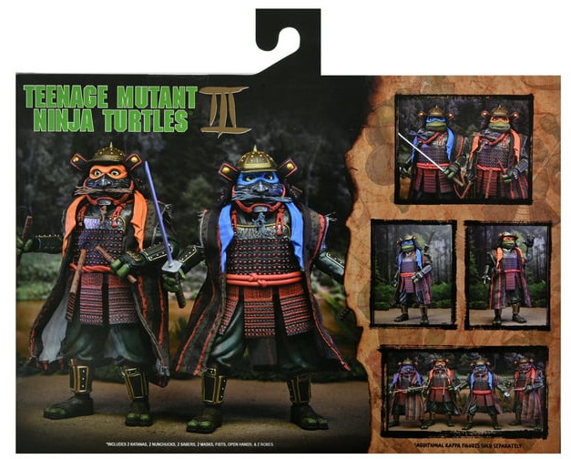 Complete your NECA TMNT movie trilogy collection with these incredible action figure 2-packs from Teenage Mutant Ninja Turtles III! Get Leonardo and Michelangelo in their samurai attire as totally radical 7-inch scale action figures. The figures come with interchangeable hands, 2 oni masks, 2 katanas, 2 nunchuks, and 2 sabers. Window box packaging.
