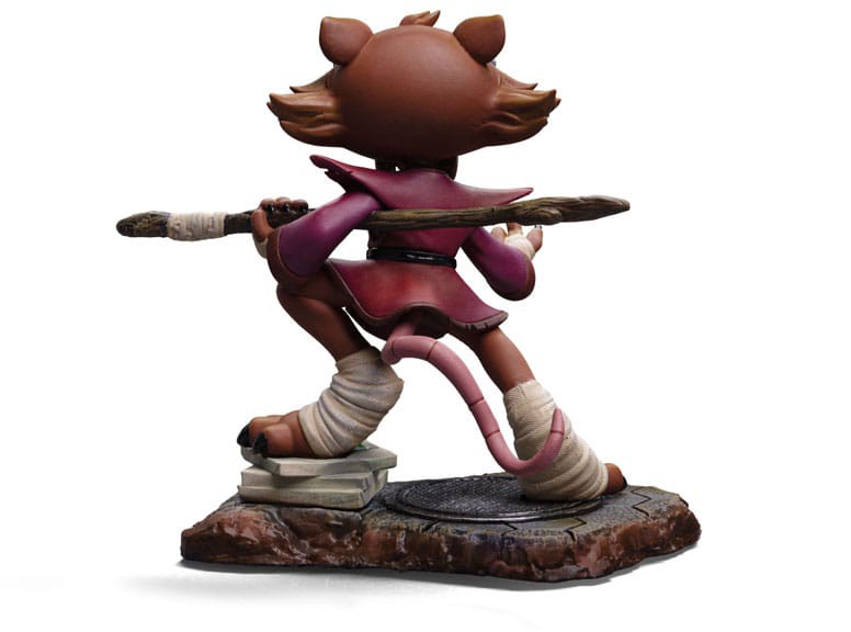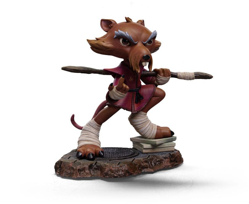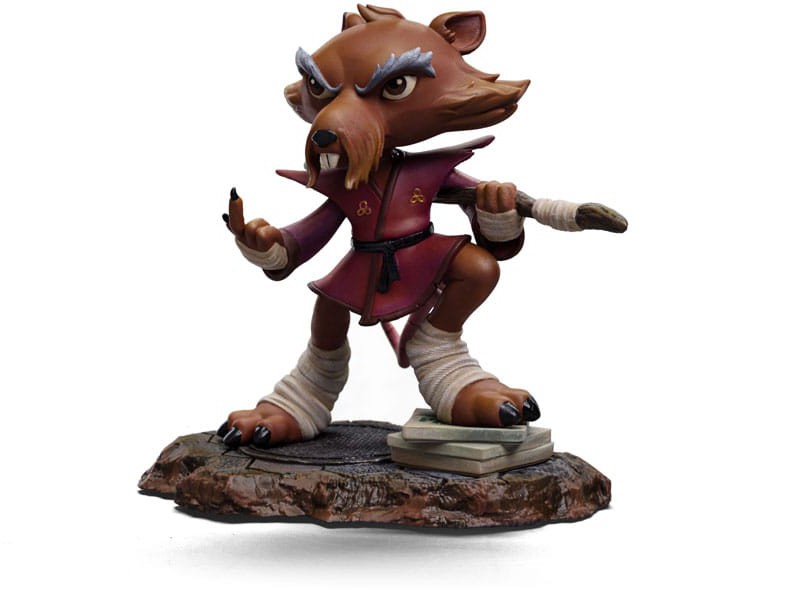 Ready for action, the wisest and most skilled anthropomorphic mutant rodent in New York fearlessly calls his opponents with the small index finger from his right hand, prepared to repel or attack with his staff positioned between his back and under his left arm, ready to be used like a Japanese Bo staff. A great master of Ninjutsu, dressed in his worn-out maroon kimono and black belt, the elderly brown-furred rat with long gray eyebrows rests his right leg on a pile of pizza boxes left by his adopted sons. Iron Studios presents the ""Master Splinter - TMNT - MiniCo"" statue, featuring the sensei of the four brother turtles who protect the city, in a Toy-Art style that has already won the hearts of fans and collectors worldwide!