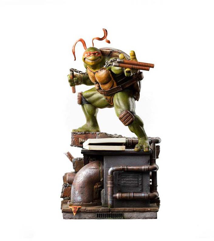 Always optimistic and with a large smile on his face, the most joyful, playful, and carefree member of the Ninja Turtles holds his Nunchakus, placed and ready for action on his skilled hands. On a pedestal in the shape of a large and cubic box from the sewers of New York, with a suggestive pizza box, his favorite delicacy, fallen by his feet, Iron Studios present their statue "Michelangelo BDS - TMNT - Art Scale 1/10", with the youngest member of the group, and usually the most innocent and childish, but always extremely loyal and affectionate. Using an orange mask as identification, he was nicknamed Mike or Mikey by his brothers, but his real name comes from the Italian sculptor, painter, architect, and poet Michelangelo Buonarroti.