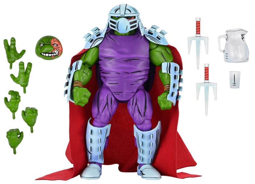 Som i Eastman & Lairds Teenage Mutant Ninja Turtles-serietidningar från Mirage Studios! Raphael tar på sig rollen som The Shredder i denna helt nya skulptering från NECA. Denna 7-tums (ca 18 cm) actionfigur inkluderar två huvuden (skadat och argt med ögonlapp). Dessutom följer en mantel i tyg, avtagbar hjälm, extra händer, sais, kanna och glas. Levereras i en samlarvänlig förpackning med originalkonst av Kevin Eastman.