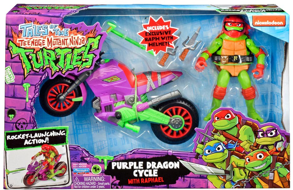 Purple Dragon Battle Cycle, inspirerad av serien ”Tales of the Teenage Mutant Ninja Turtles”, levereras med lila detaljer och en exklusiv Raphael-figur. Tryck på den gröna knappen för att skjuta iväg raketen i strålkastaren! Setet innehåller Raphael med hjälm, två Sai och 2 raketer till den främre avfyrningsrampen