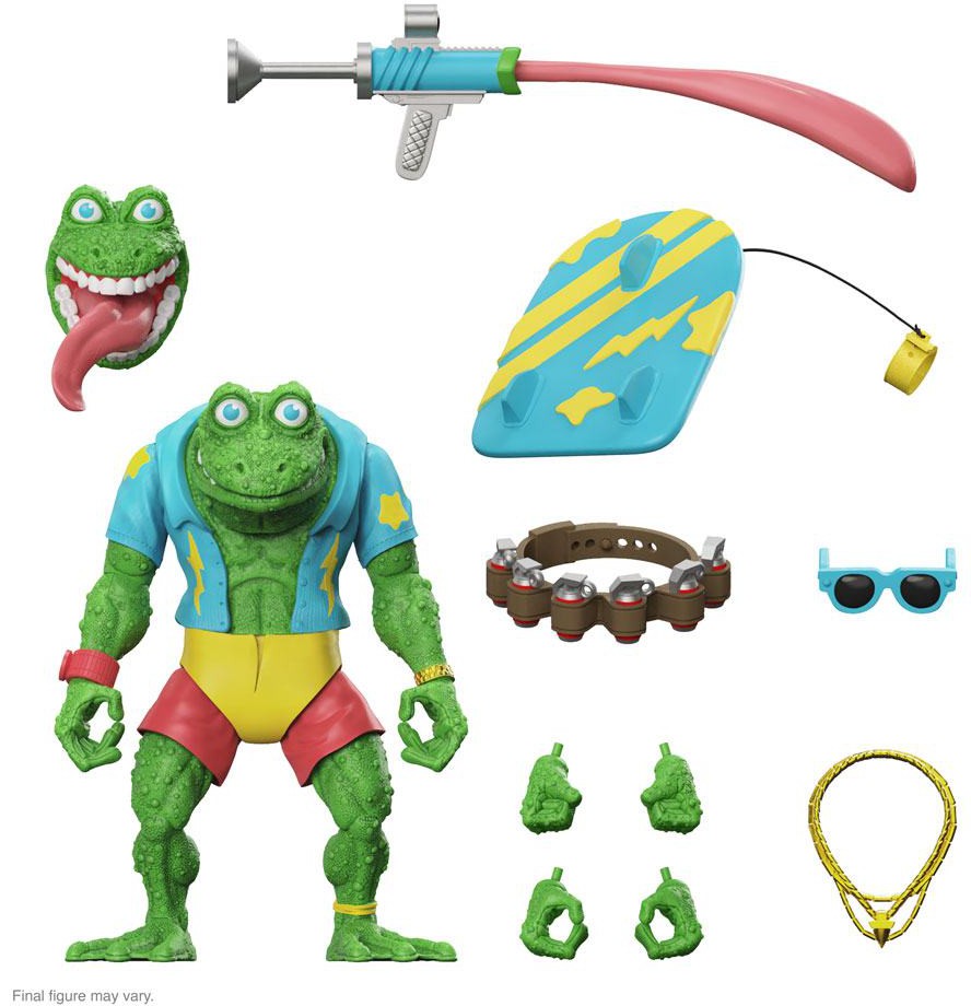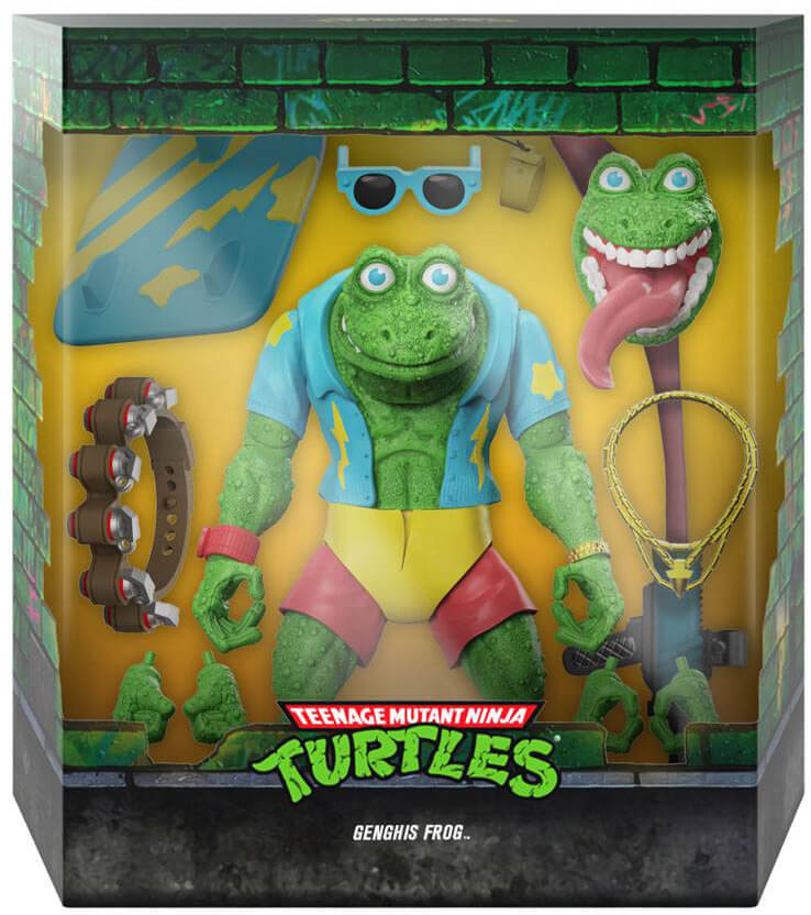 He may have been mutated and trained by Shredder, but Genghis Frog has hopped over to the Ninja Turtles' side in the fight against evil! This 7" scale highly articulated Teenage Mutant Ninja Turtles ULTIMATES! Genghis Frog figure comes with interchangeable heads & hands and a variety of other accessories, including his Tongue Gun, boogie board, and more. Make the leap and secure your made-to-order Genghis Frog ULTIMATES! figure!