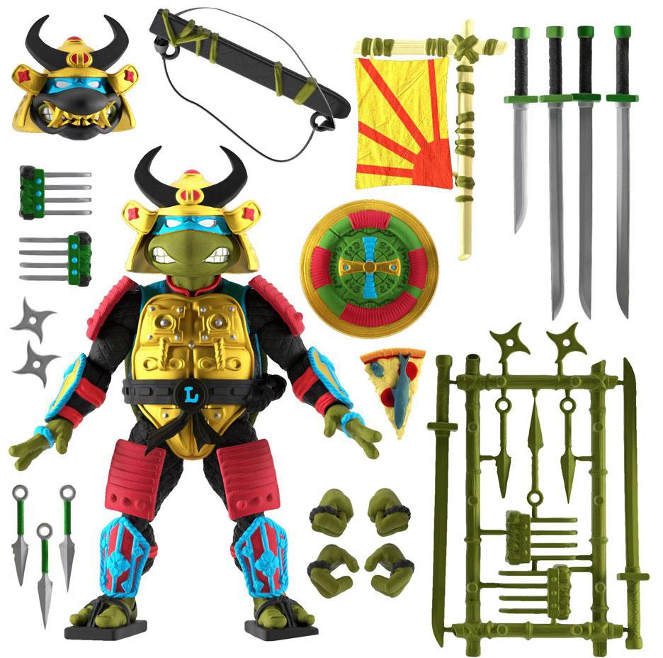 It's not all fun and games being a Teenage Mutant Ninja Turtle, and with his relentless studying and training, Leonardo leads by example as he and his brothers take on crime in the big city! This made-to-order 7" fully articulated Leo the Sewer Samurai ULTIMATES! Figure comes with alternate heads and hands and a variety of accessories, including his Wacky War Banner, Samurai shield & sheath, a slice of pizza, and a weapon rack with his shuriken, kunai, samurai claws, and katanas. Leonardo takes crime-fighting seriously, and any serious collector won't hesitate to add the Samurai Battle Commander to their Teenage Mutant Ninja Turtles ULTIMATES! lineup.