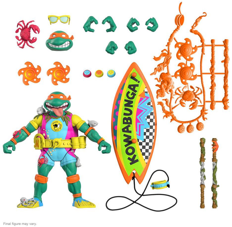 This 7" scale fully articulated Teenage Mutant Ninja Turtles ULTIMATES! figure of Sewer Surfer Mike features super gnarly surfer gear detail and comes with interchangeable heads and hands, as well as iconic accessories, including his Sewer Worthy Surfboard, Seaweed Nunchucks, and a weapon rack in case he has to wipe out some baddies while hangin' FOUR! The sewers may not exactly be Hawaii's North Shore Pipeline, but they are a LITERAL pipeline, and Michelangelo wouldn't have it any other way. Don't wave away the chance to add the Teenage Mutant Ninja Turtles ULTIMATES! Sewer Surfer Mike figure to your collection!