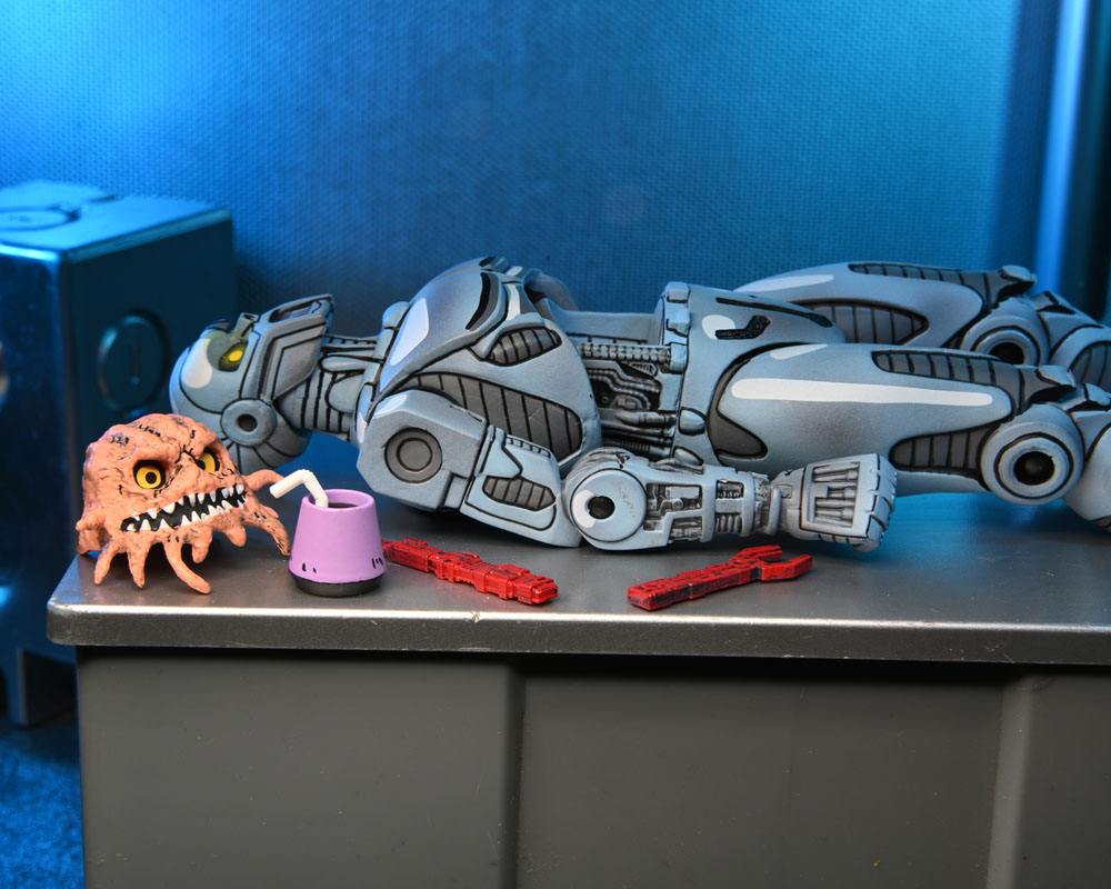 Based on the original Eastman & Laird Teenage Mutant Ninja Turtles comic books from Mirage Studios! These robot exoskeletons look fierce, but the Utroms are peaceful aliens who crashed on Earth and have been hiding behind their shell corporation, T.C.R.I. This 7" scale exoskeleton has a removable Utrom and includes interchangeable heads and hands, blaster, tools, and... is that a sippy cup? Hey, even tentacled aliens have to stay hydrated. Comes in all new special comic-book themed window box packaging illustrated by Kevin Eastman.