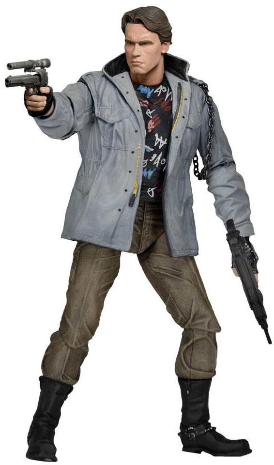 The Ultimate Tech Noir T-800 features that punk outfit with metal jacket chain film and bears the likeness of Arnold Schwarzenegger. The deluxe 18 cm figure has over 25 points of articulation, plus 3 interchangeable heads, interchangeable right forearm, alternate hand, a small arsenal of weaponry, and two surgical tools for post-battle repairs.