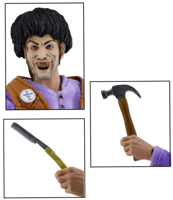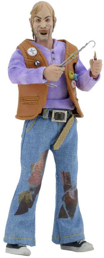 From the 1986 film, Leatherface's sadistic brother Chop Top stands 20 cm tall and is dressed in intricately detailed and tailored fabric clothing similar to the iconic toy lines of the 1970s.