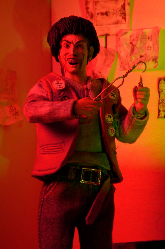 He's fully poseable and comes complete with tons of accessories: wire hanger, razor, lighter, hammer, removable wig and removable glasses.