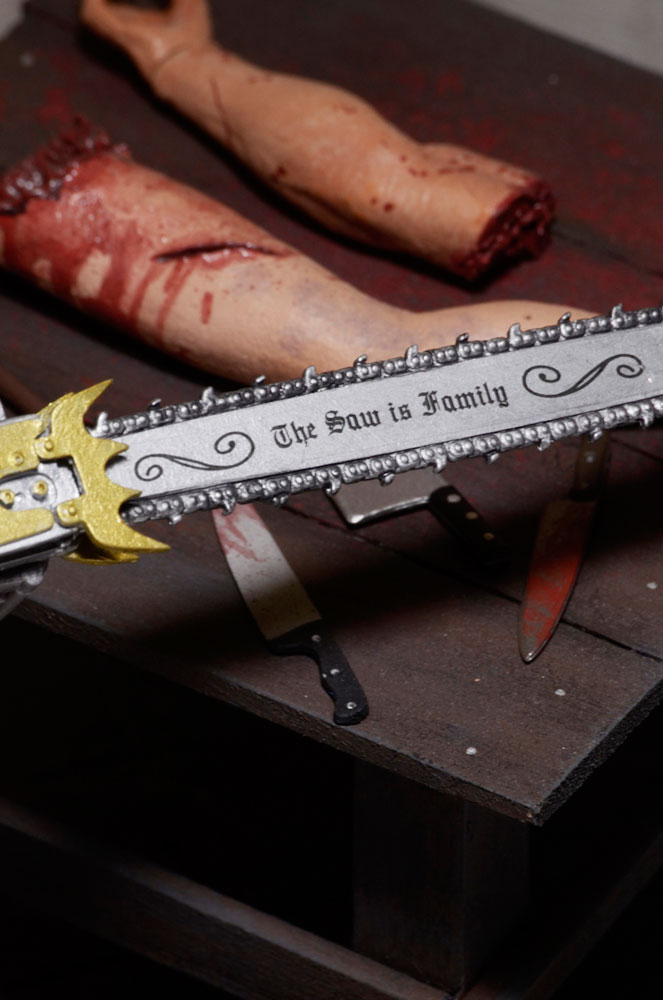 True to the movie, the blade of his chainsaw is inscribed "The Saw Is Family" and he wears a leg brace.
