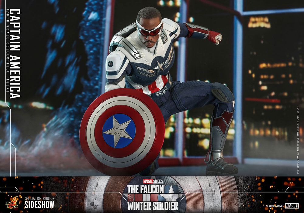 Figuren är mästerligt utformad utifrån Anthony Mackies framträdande som den nya Captain America i seriefinalen av The Falcon and the Winter Soldier och har ett nyutvecklat huvud med ansiktsmask och skyddsglasögon, en ny taktisk outfit i blå, vit och röd färgskala med ett Star-emblem, Captain Americas ikoniska sköld, en flygryggsäck, en Redwing-drönare och detaljerad återgivning av de massiva vingarna Mått ca 80 cm bred, utformad med utökade ledmöjligheter för otroliga actionscener.