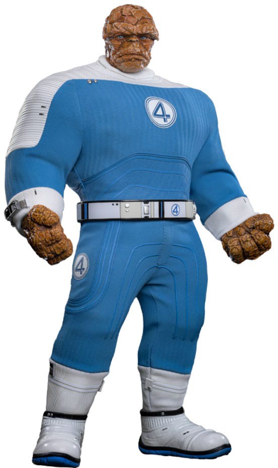 He wears a Fantastic Four uniform made from blue and white ribbed fabric. The upper suit is removable, letting fans display his iconic bare-chested look. A belt with the FF emblem and matching boots complete his outfit.