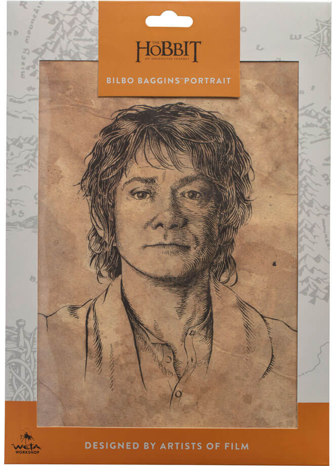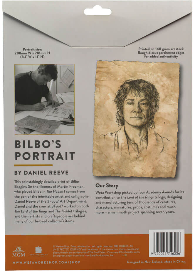 Detta mödosamt detaljerade tryck av Bilbo Baggins (i likhet med Martin Freeman, som spelade Bilbo i The Hobbit) kommer från pennan av konstnären och kalligrafen Daniel Reeve från 3Foot7 Art Department. Daniel och besättningen på 3Foot7 arbetade på både Sagan om ringen- och Hobbiten-trilogierna, och deras konstnärer och hantverkare ligger bakom många av våra älskade samlarföremål.