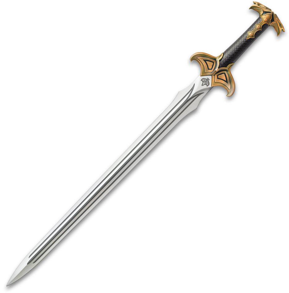 The Sword of Bard the Bowman features a hilt bearing design motifs of ancient Dale, with a pommel in the shape of twin bird heads and a leather wrapped grip embossed with an overlapping scaled feather pattern. The blade is adorned with engraved grooves and a rune etching.