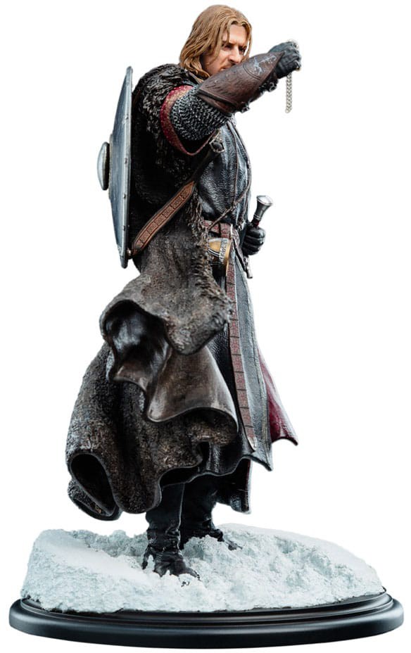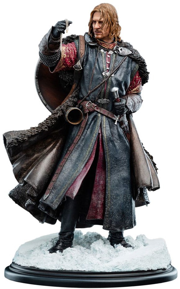 Every fold of his fur-lined cloak, every strain of contemplation upon his brow, every subtle glint of gold in the Ring's cruel form-this statue is more than a mere depiction. It is a study of a noble warrior's struggle, wrought with reverence and precision. From the sculptor's hand to your collection, this is Boromir as you have never seen him before, frozen in the moment that foreshadowed his tragic end.