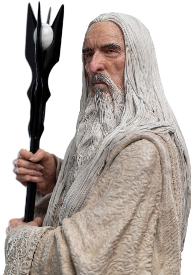 - Saruman the White is presented in his signature pose and clothing, as seen in The Lord of the Rings Trilogy;