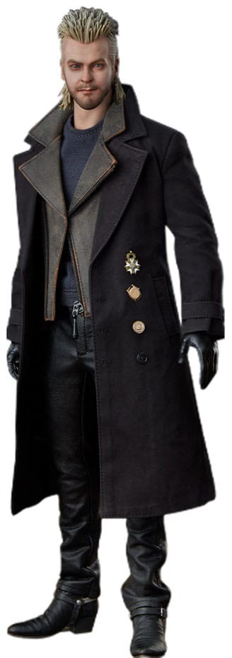 The David Sixth Scale Figure is a mixed media collectible featuring a faithful likeness of actor Kiefer Sutherland and a custom-tailored, movie-accurate fabric costume. His outfit is layered with an undershirt, a faux-leather jacket, an overcoat with decorative medals and buttons, and faux-leather pants. David comes with both a neutral portrait and a fanged vampire portrait, each detailed with his feathered earring and his sculpted hair styled in a textured blonde mullet.