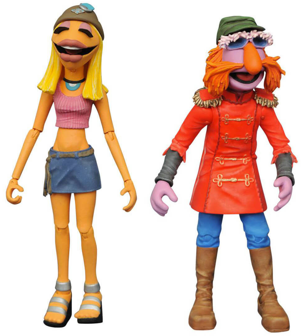 It makes us very happy to introduce to you the next assortment of Muppets Select action figures from DST! Muppet Show and Up Late star Miss Piggy comes with her precious dog Foo Foo and a Penguin, while Electric Mayhem bassist Floyd Pepper comes with guitarist/love interest Janice, and pianist Rowlf comes with the certifiable Crazy Harry!