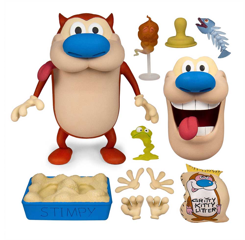 "Happy Happy! Joy Joy!" Super7's Ren & Stimpy Deluxe 7" Deluxe Figures! Stimpy J. Cat will come in deluxe packaging with this assortment of hilarious accessories: alternate face, alternate hands, bag of gritty kitty, fart, fish skeleton, litter box, nose goblin, rubber nipple hat.