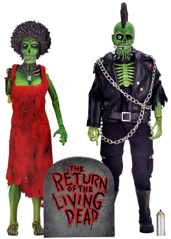 Get your retro fix and celebrate the 1985 horror-comedy movie The Return of the Living Dead with this Trash and Suicide clothed action figure 2-pack! Based on the cult classic film's original poster art, these poseable 8-inch figures are dressed in tailored fabric clothing similar to the toy lines that helped define the licensed action figure market in the 1970s. These fully articulated figures include a spray paint can and gravestone featuring the film logo. Comes in collector-friendly window box packaging.