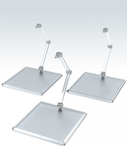 Presenting a set of 3 simple and affordable display stands! These stands feature a plain, translucent design perfect for articulated figures, chibi figures, plastic models and more. The support arm is equipped with a 3 mm pin for connecting to holes of corresponding size. Attachable clamp-style parts and extender parts for tights spaces are also included. ABS Construction. Translucent materials. The base area is 9,5 x 9,5 cm. Support arm can be adjusted from 7 to 12,8 cm in height.