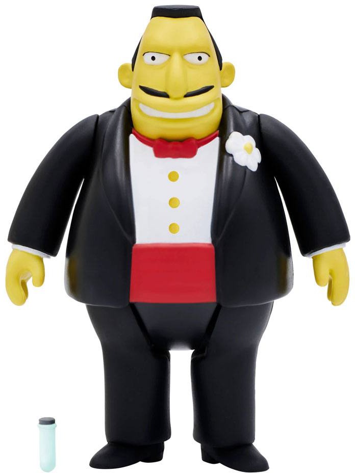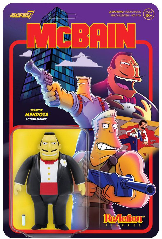 As seen in The Simpsons! This 3.75" articulated McBain ReAction figure of Mendoza shows McBain's nemesis in his tuxedo outfit from the banquet scene where he announced the creation of Swank, his highly-addictive, diabolical new drug. Collect the entire line of The Simpsons McBain ReAction figures!
