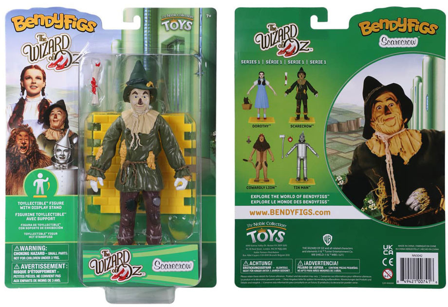 Each approximately 7.5 inch figure comes on a Yellow Brick Road base, in four colour blister pack cards, allowing our Bendyfigs to be displayed from a Euro hook or free standing on a shelf.