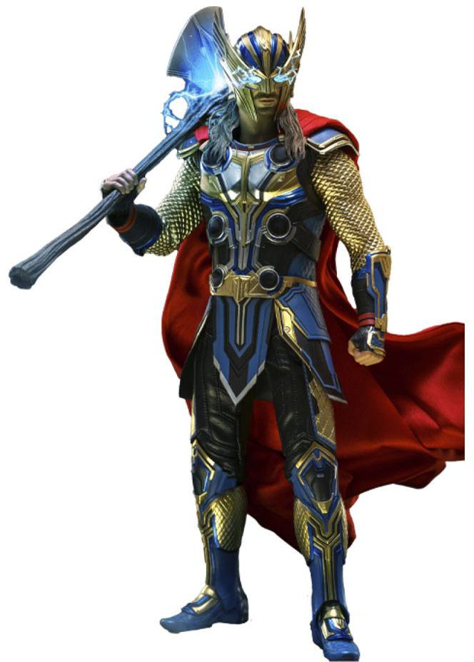Inför Thor: Love and Thunder är Sideshow och Hot Toys stolta att presentera Deluxversionen av God of Thunder i hans nya metalliska kostym i blått och guld och röd mantel.