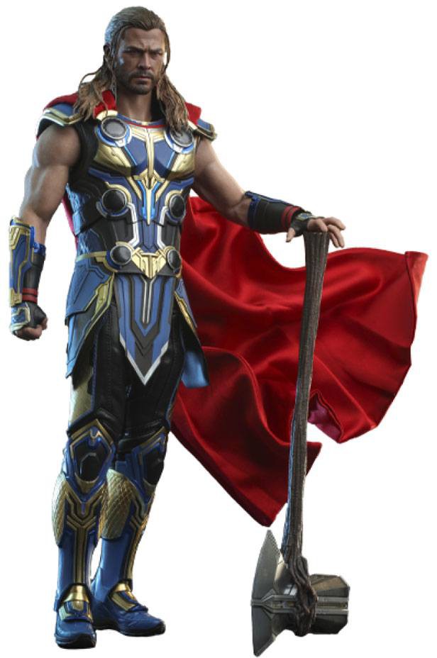 Inför Thor: Love and Thunder är Sideshow och Hot Toys stolta att presentera Deluxversionen av God of Thunder i hans nya metalliska kostym i blått och guld och röd mantel.