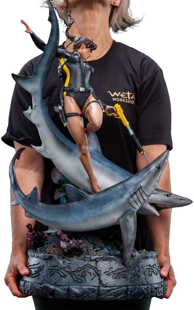 Skulpterad med enastående precision återges Lara så som hon syns i Tomb Raider: Underworld, fullt utrustad i våtdräkt och dykutrustning med harpungevär i handen.