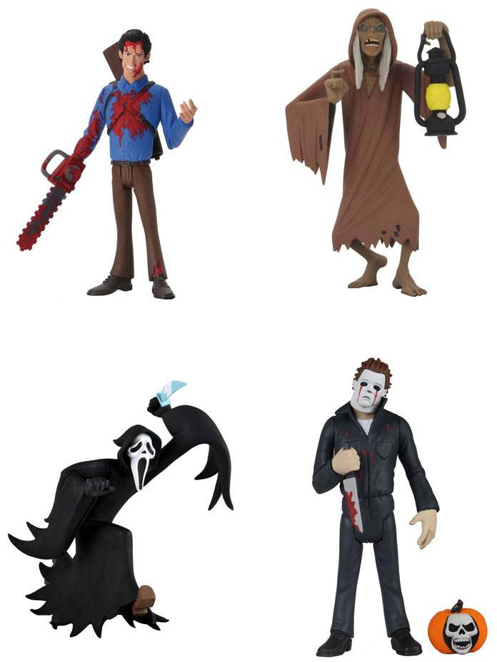 Innehåll: Ghostface med knivtillbehör, Creep (Creepshow) med lyktutrustning, Bloody Ash (Evil Dead 2) och Bloody Tears Michael Myers (Halloween 2).