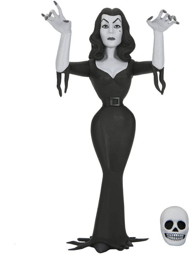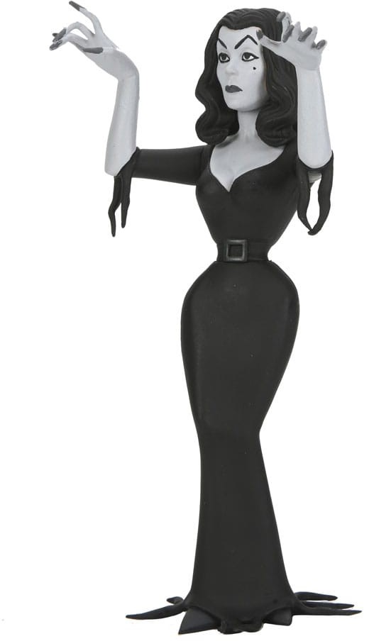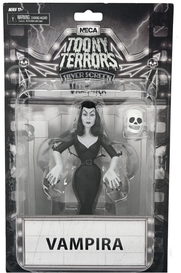 Bring the fun of Silver Age cartoons to your horror collection with the adorable little creeps of Toony Terrors, NECA's line of stylized horror icons The Silver Screen Edition series brings to life fan-favorite characters from classic black-and-white media. Standing approximately 6 inches tall, this Vampira action figure features a grayscale deco with skull accessory and comes in special black-and-white packaging with cutout backdrop and silver foil logo.