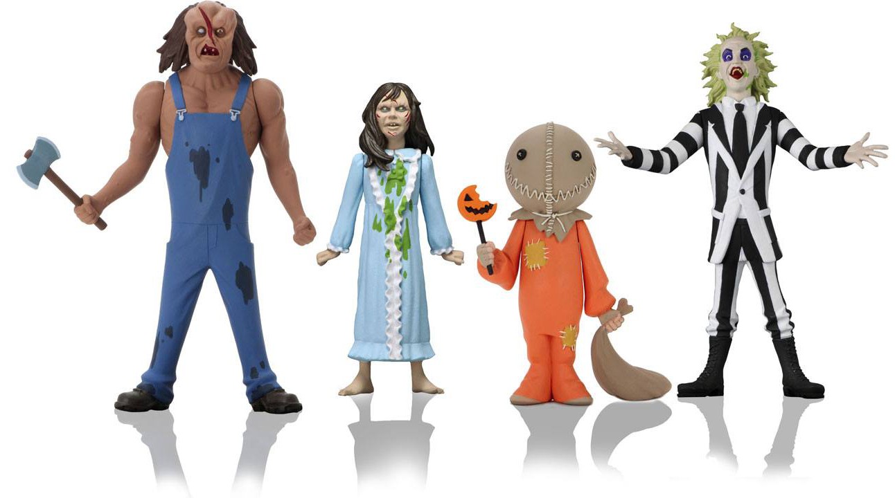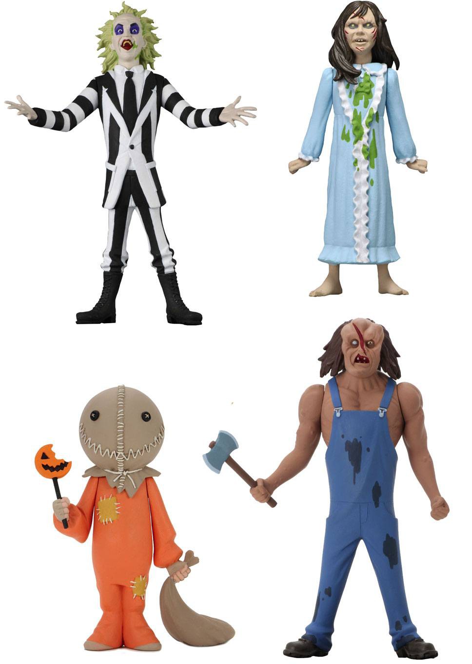 Standing approximately 6 inches tall, the action figure assortment includes Beetlejuice (Beetlejuice), Victor Crowley (Hatchet) with axe accessory, Regan (The Exorcist) with interchangeable head, and Sam (Trick r Treat).