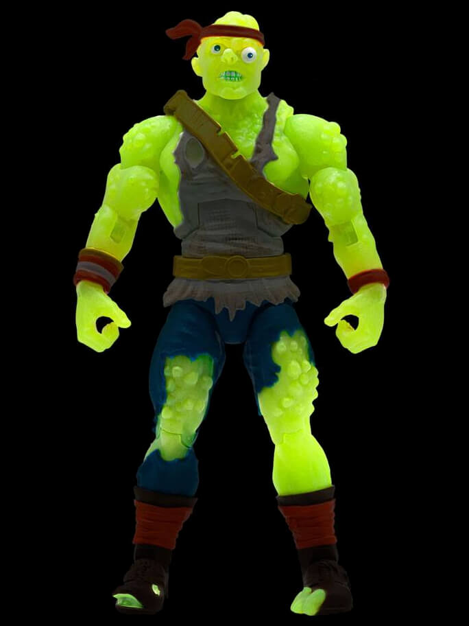 It's Toxie, like you've never seen him before! With translucent green glow-in-the-dark injection and UV reactive color changing paint, this ULTIMATES! figure will have three different looks, as if Toxie is reacting to climate change! His standard appearance features bright neon paint, and in sunlight, Toxie will almost instantly change to an angry red! In the dark, he will glow a menacing green!