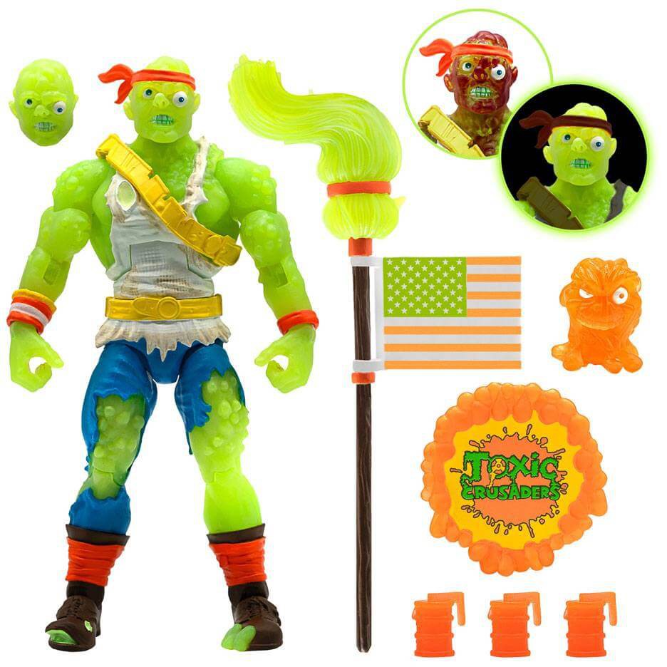 Radioactive Red Rage Toxic Crusader ULTIMATES! figuren kommer med utbytbara huvuden och tillbehör, inklusive ett bälte med granater, en mopp med en clip-on flagga och en genomskinlig orange Toxic Crusaders-märkessköld.