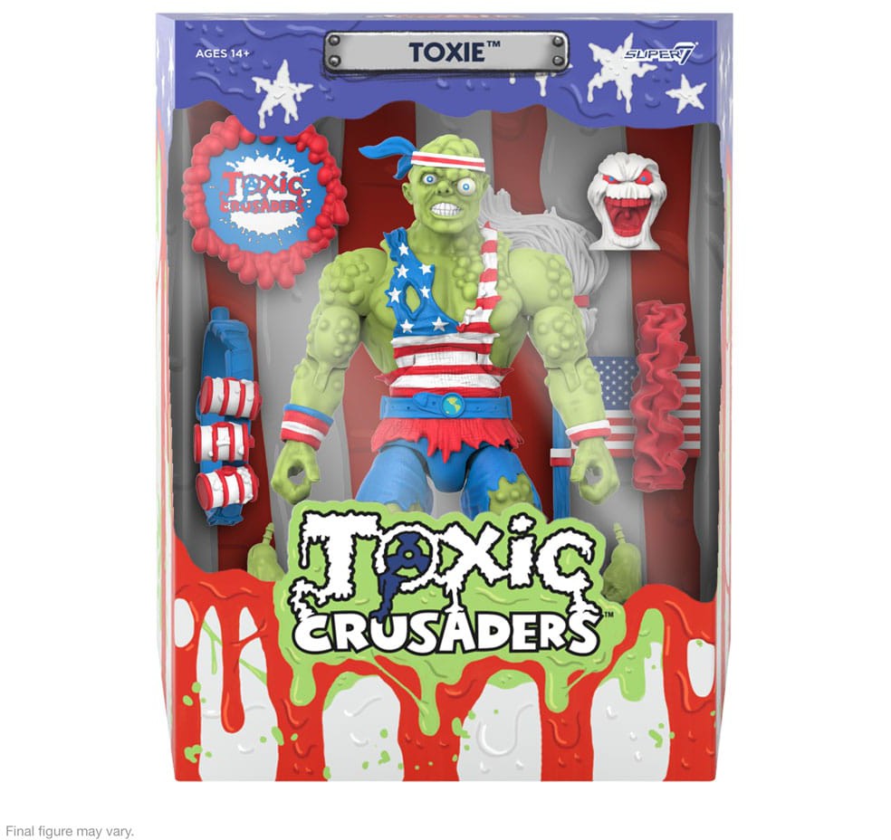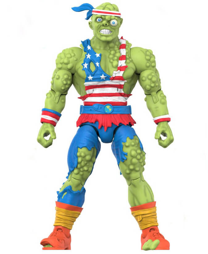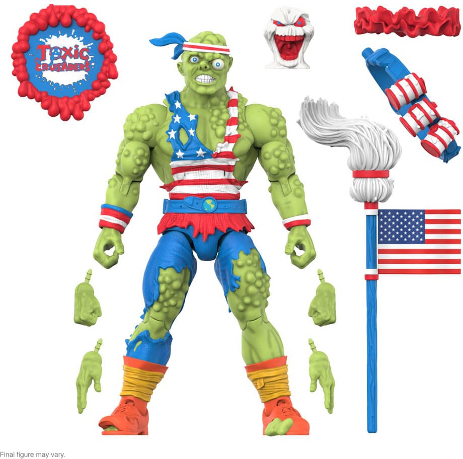 He may not be pretty, but you'll be holding your breath until you're red, white, and blue in the face before you find a hero who loves his country more than Toxie! This 7" scale, highly articulated Toxic Crusaders ULTIMATES! Toxie is inspired by the never-released mail away vintage action figure and features the leader of the Crusaders in patriotically-themed clothing and comes with accessories including a mop with flag, a bandoleer with a trio of toxic waste grenades, a Blobbie mini figure, and more! With intricate sculpt and premium paint detailing, this made-to-order figure Toxic Crusaders ULTIMATES! won't be a trashy addition to your collection!
