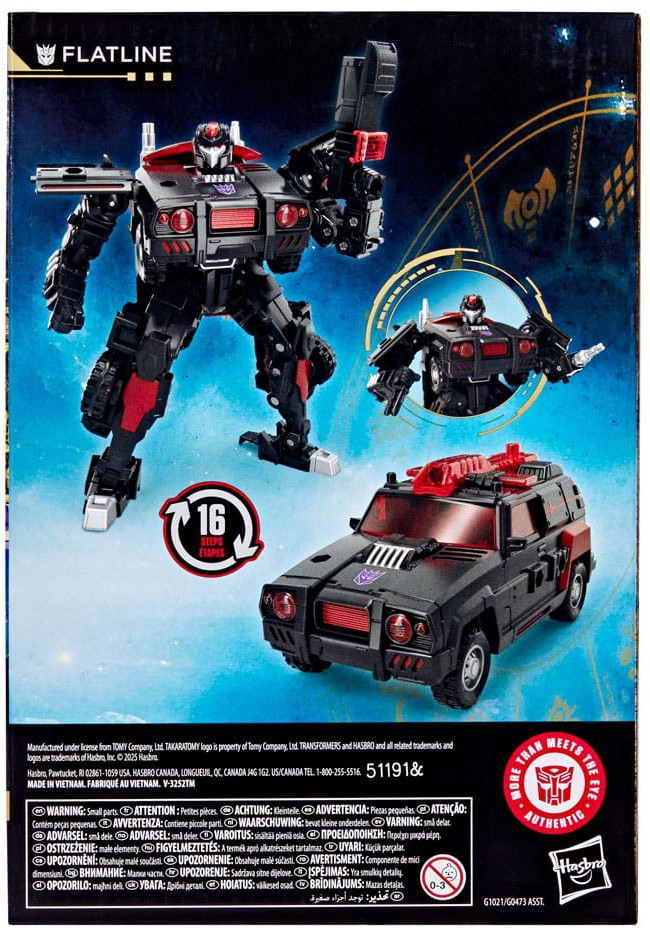 Experience the epic universe of Transformers robots with the Transformers Flatline toy! The 7-inch (17.5 cm) figure converts from robot action figure to offroad vehicle in 16 steps. With intricate poseability and attachable accessories like hand missiles and a cannon, this Flatline action figure makes an awesome addition to any collection. Look for more Transformers collectible toys (sold separately, subject to availability) featuring favorite characters like Optimus Prime, Bumblebee, Megatron, and more to create a lineup that is - More Than Meets the Eye.