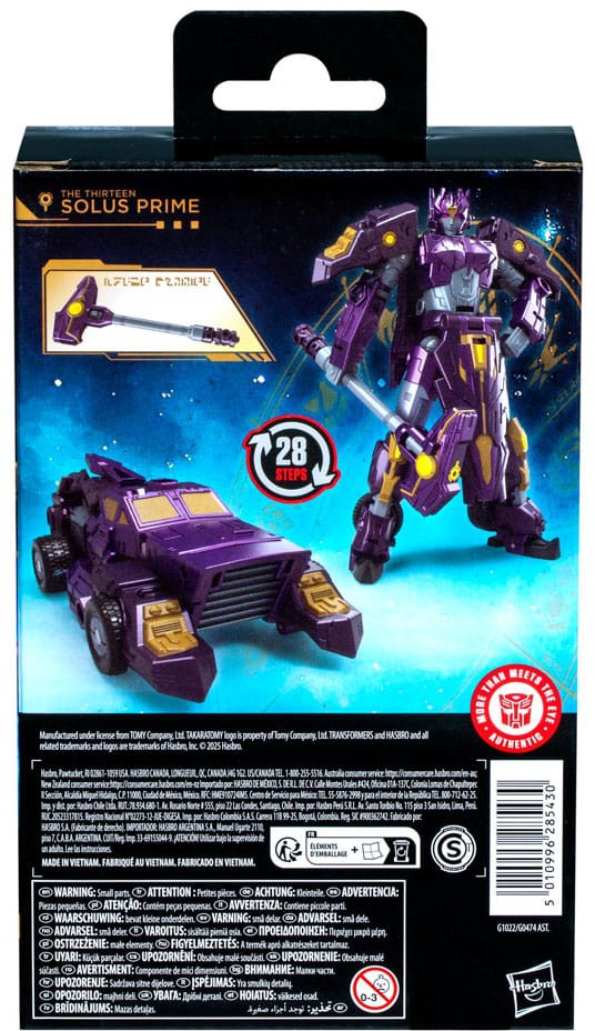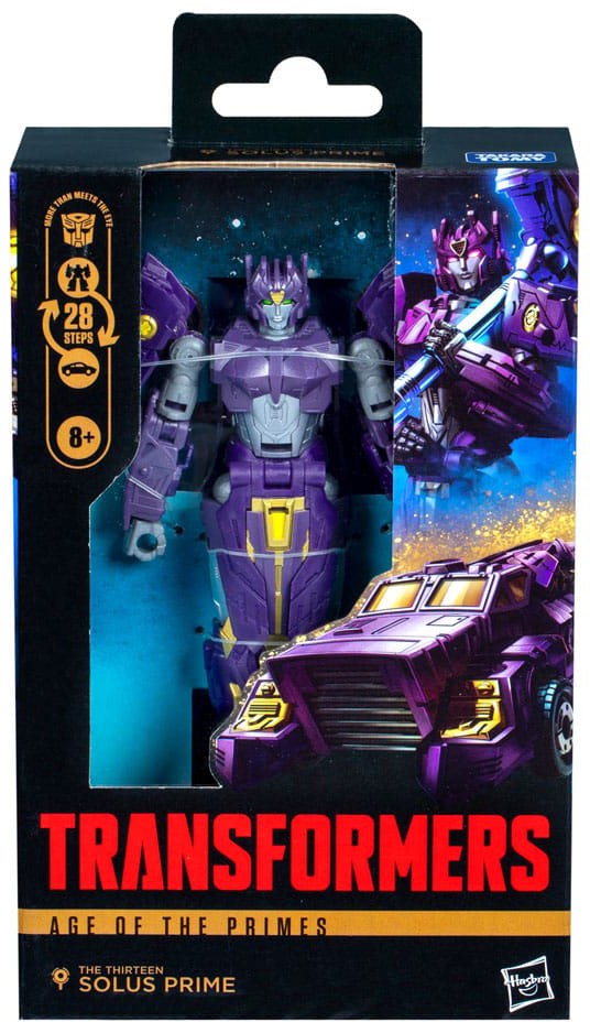 Unite your favorite characters from across the world of Transformers robots into your collection with the Transformers Age of the Primes Deluxe Class The Thirteen Solus Prime action figure! This 5.5-inch The Thirteen Solus Prime action figure converts between robot and Cybertronian armored car modes in 28 steps. Includes a Forge of Solus Prime Artifact hammer accessory that attaches to the figure. The Thirteen Solus Prime figure is inspired by the character from the Transformers universe and features articulated head, arms, and legs for awesome action poses. Transformers: Age of the Primes opens up the world of the Primes, the very first bots in Transformers mythology, a pantheon of Thirteen beings, each with a unique ability and personality. Every battle, every bot, and every power in the Transformers universe can be traced back to one of The Thirteen. Collect and combine different Transformers figures to create your ideal Age of the Primes lineup.